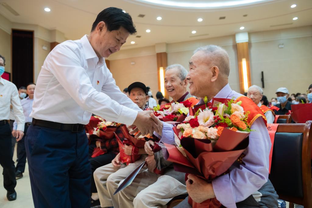 寿星代表、化学学院退休教授汪焱刚1959年来到华师,是学校翻天覆地变化中的亲历者与见证人。“我想趁着身体和精神比较好的时候,对学校、学院做一些有益的工作。”汪焱刚老师动情地说。怀着这样的信念,他在退休生活里坚持老有所为,笔耕不辍。他充分肯定了学校在老同志工作方面的创新举措,希望老同志们老来康泰、老有所为。
