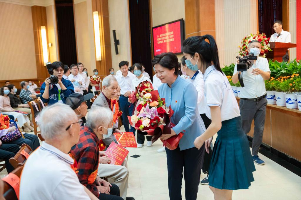 校党委书记赵凌云给90岁寿星代表献花