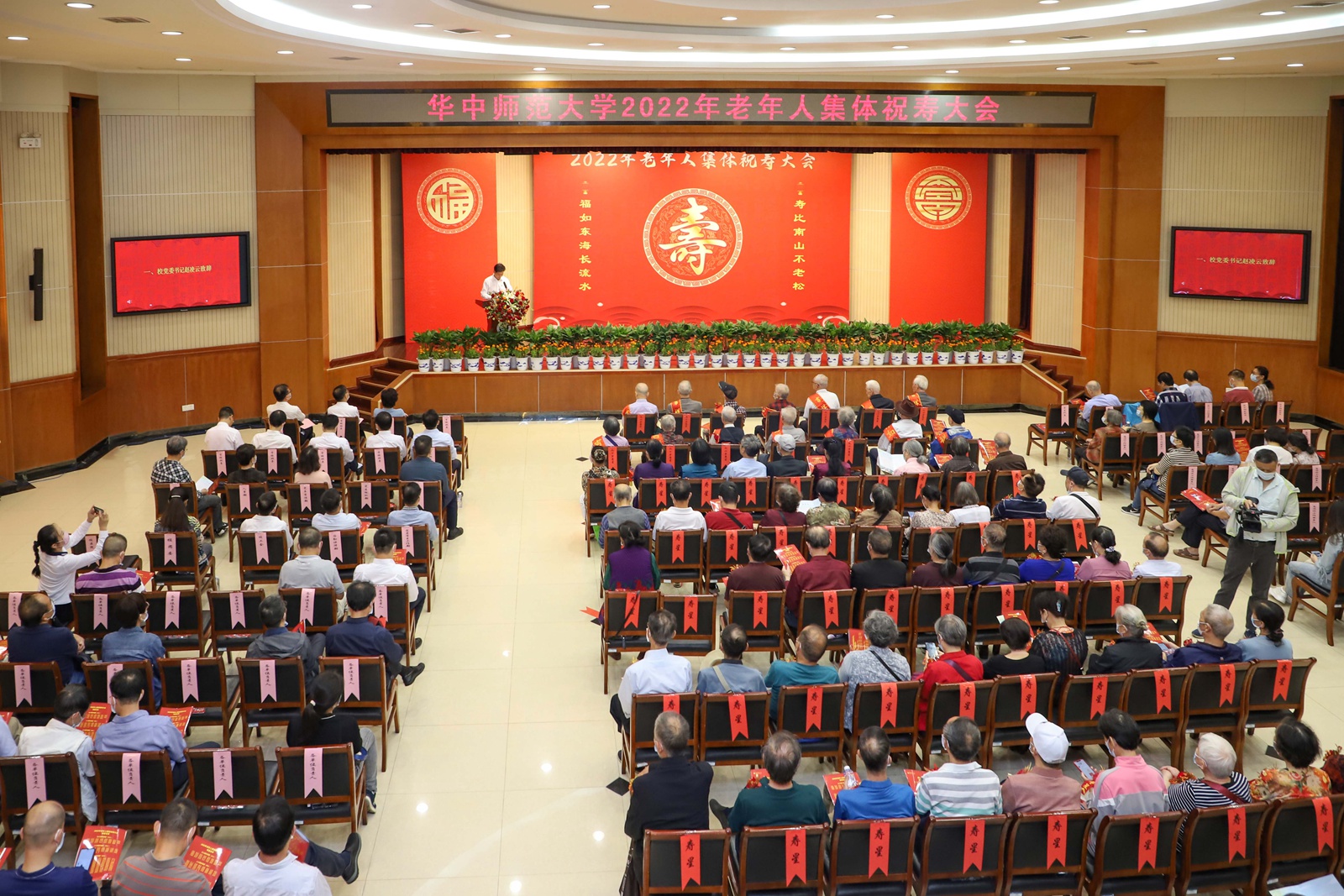 华大在线讯(记者 张严溢)“谁言秋色不如春,及到重阳景自新。”10月4日,凯发k8官网,凯发k8网址2022年老年人集体祝寿大会在科学会堂一楼报告厅举行,凯发k8官网,凯发k8网址年满90岁、80岁、70岁的寿星代表齐聚一堂,欢度重阳。校党委书记赵凌云,校长、党委副书记郝芳华,校党委副书记查道林,副校长彭南生、夏立新、任友洲、彭双阶,校党委副书记陈迪明出席。各学院(学部)、各部门主要负责人、离退休工作联系人、在职教师代表与学生代表参加。大会由李鸿飞主持。