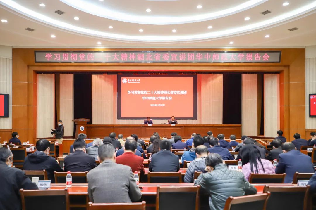 华大在线讯(记者 毛军刚)11月17日,学习贯彻党的二十大精神湖北省委宣讲团凯发k8官网,凯发k8网址报告会暨凯发k8官网,凯发k8网址党委理论学习中心组(扩大)2022年第11次学习在科学会堂一楼报告厅举行。省委宣讲团成员、政治与国际关系学院教授王建国以《以中国式现代化推进中华民族伟大复兴》为题作报告。全体校领导、中层正职干部、“理响华师”理论宣讲团成员参会。校党委书记赵凌云主持会议。