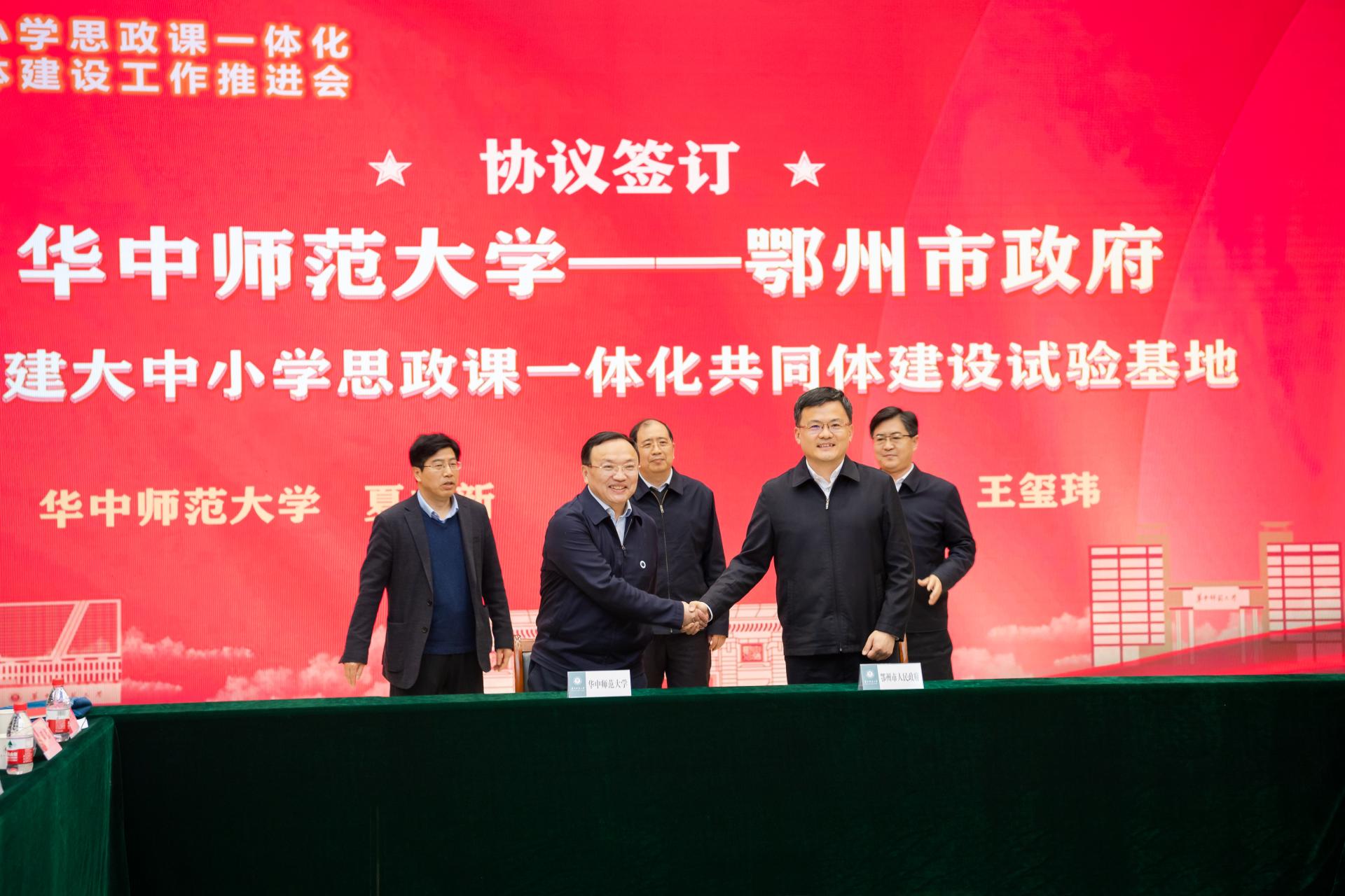 夏立新介绍,凯发k8官网,凯发k8网址积极推进思政课一体化建设,坚持政治统领、改革创新、同频共振、示范引领,探索构建一体化机制,深耕一体化课程建设,推进一体化资源共享,打造一体化建设品牌,牵头申报并获批了教育部大中小学思政课一体化共同体(湖北省)。作为教育部大中小学思政课一体化共同体(湖北省)建设牵头高校,学校将充分发挥教师教育、人文社科、教育数字化等优势,在数字赋能思政课、校地共建等方面做出特色、办成精品、形成品牌,为推动思政课内涵式发展,构建具有湖北特色的教育发展新格局作出新的更大贡献。会上,教育部大中小学思政课一体化共同体(湖北省)建设正式揭幕。夏立新和王玺玮代表双方签订凯发k8官网,凯发k8网址——鄂州市政府共建大中小学思政课一体化共同体建设试验基地框架协议。鄂州市、武汉大学、华中科技大学、宜昌市教育局、红安县第一中学等五家单位作发言交流。