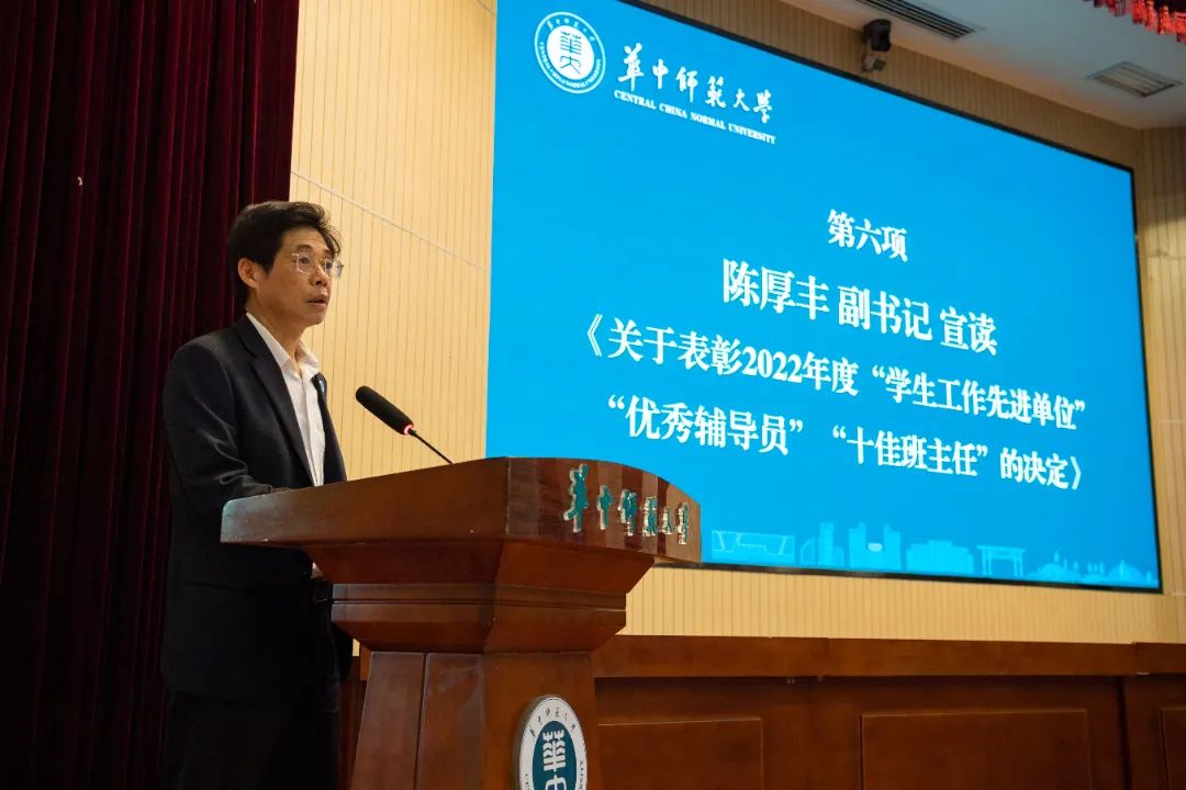校党委副书记、纪委书记陈厚丰宣读《凯发k8官网,凯发k8网址表彰2022年度“学生工作先进单位”“优秀辅导员”“十佳班主任”的决定》
