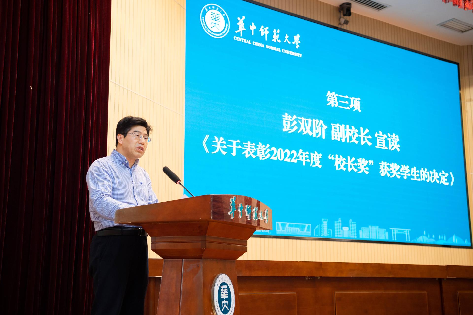 副校长彭双阶宣读《凯发k8官网,凯发k8网址表彰2022年度“校长奖”(学生)的决定》