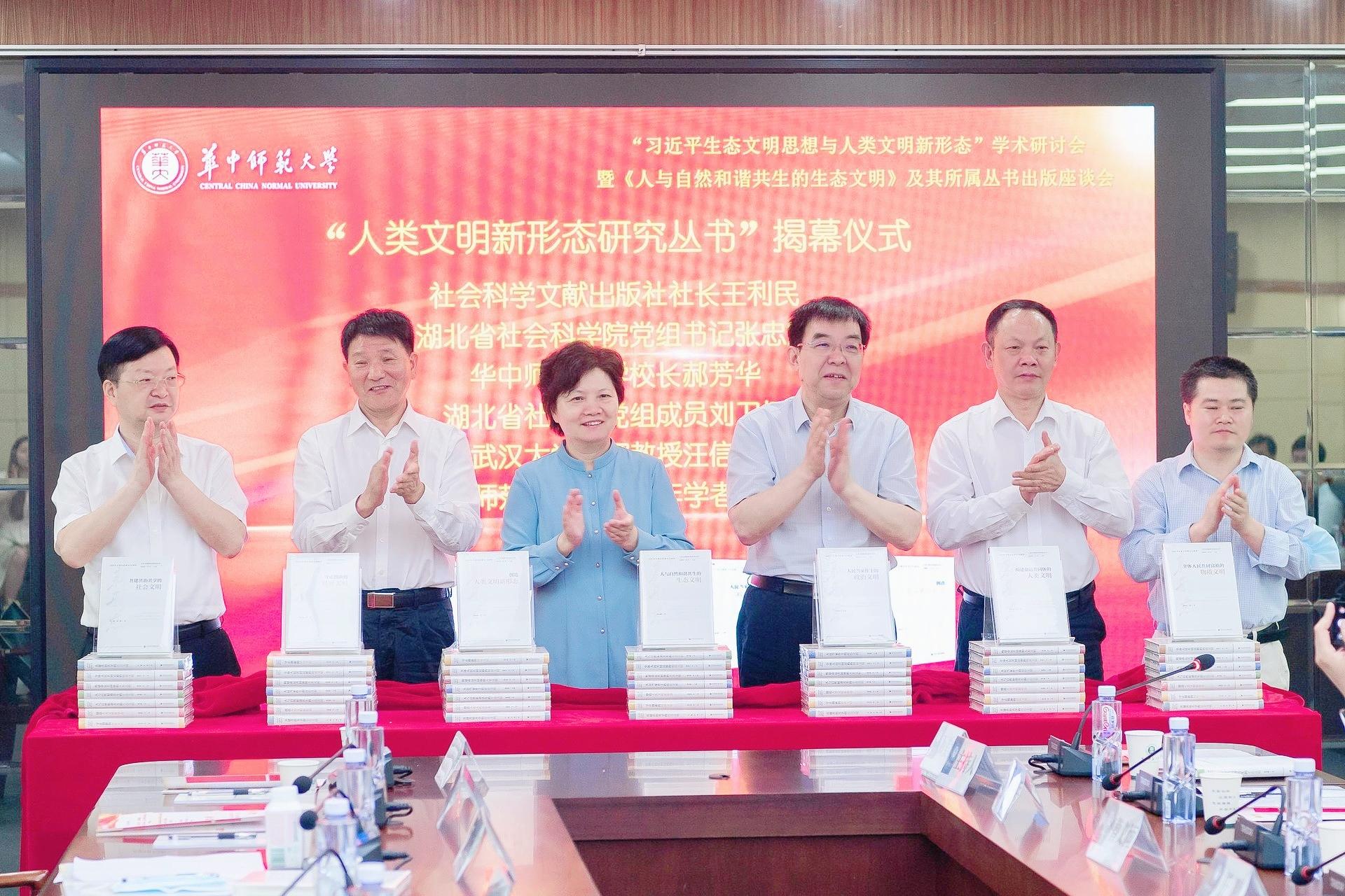 在“人类文明新形态研究丛书”揭幕仪式上,校长郝芳华、社会科学文献出版社社长王利民、湖北省社会科学院党组书记张忠家、湖北省社会科学界联合会党组成员刘卫桥、武汉大学资深教授汪信砚、凯发k8官网,凯发k8网址桂子青年学者戴圣鹏等共同为新书揭幕。在学术研讨阶段,与会专家学者围绕“习近平生态文明思想与人类文明新形态”主题,就习近平生态文明思想、人类文明新形态、中国式现代化与人类文明新形态、人类命运共同体与人类文明新形态、人类文明新形态与全球文明倡议、“人类文明新形态研究丛书”之出版价值等方面内容进行了深入探讨。