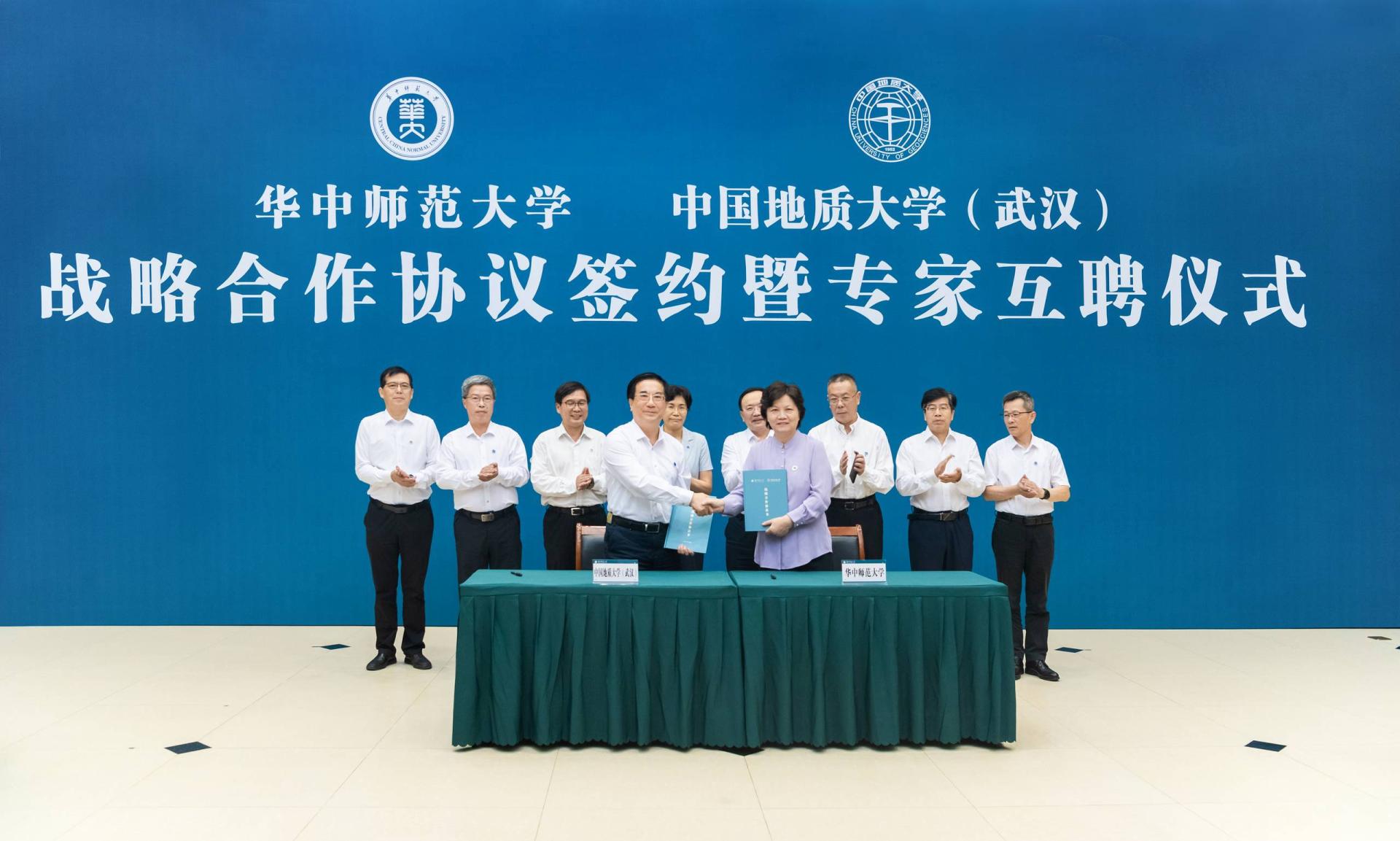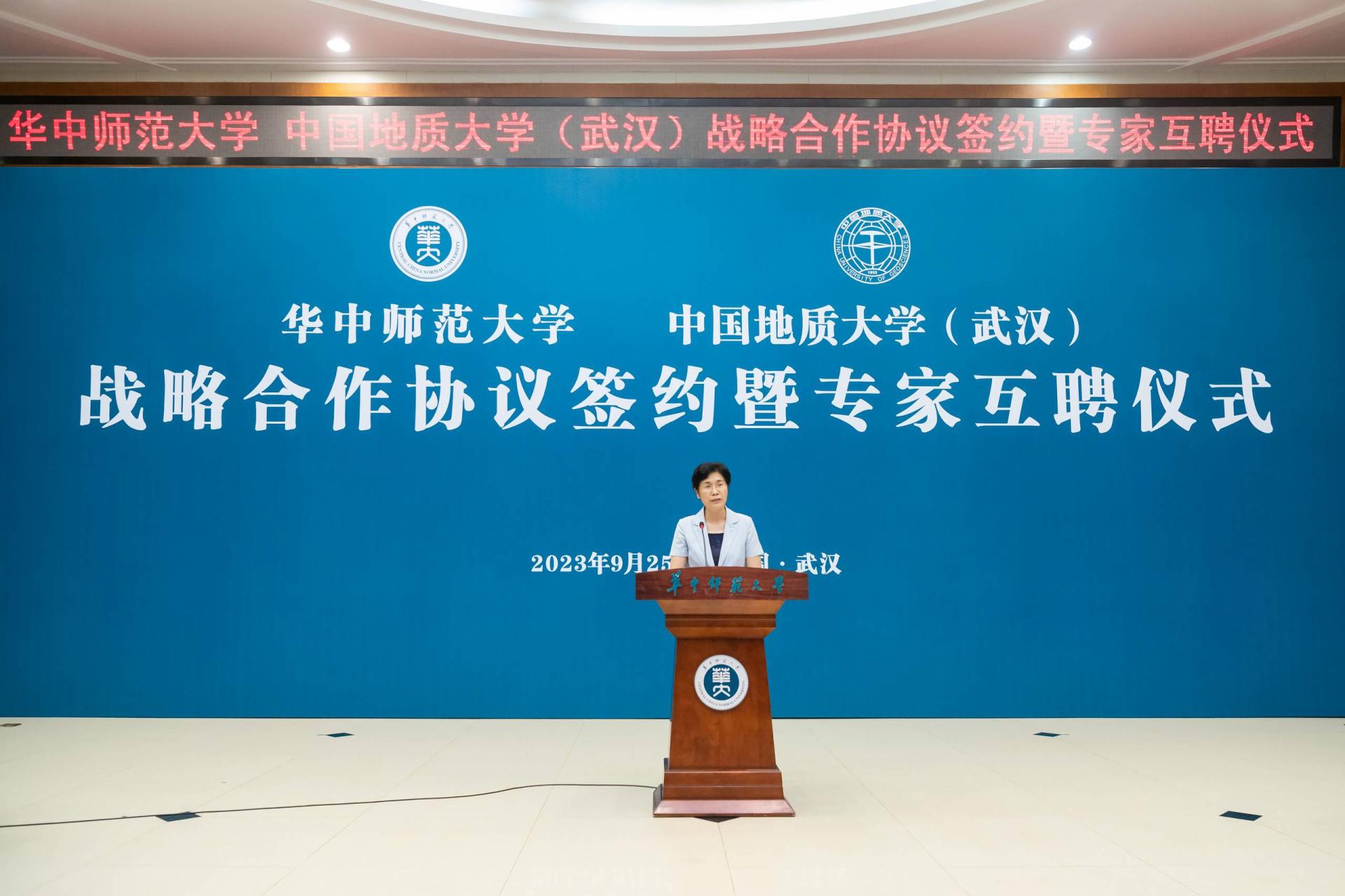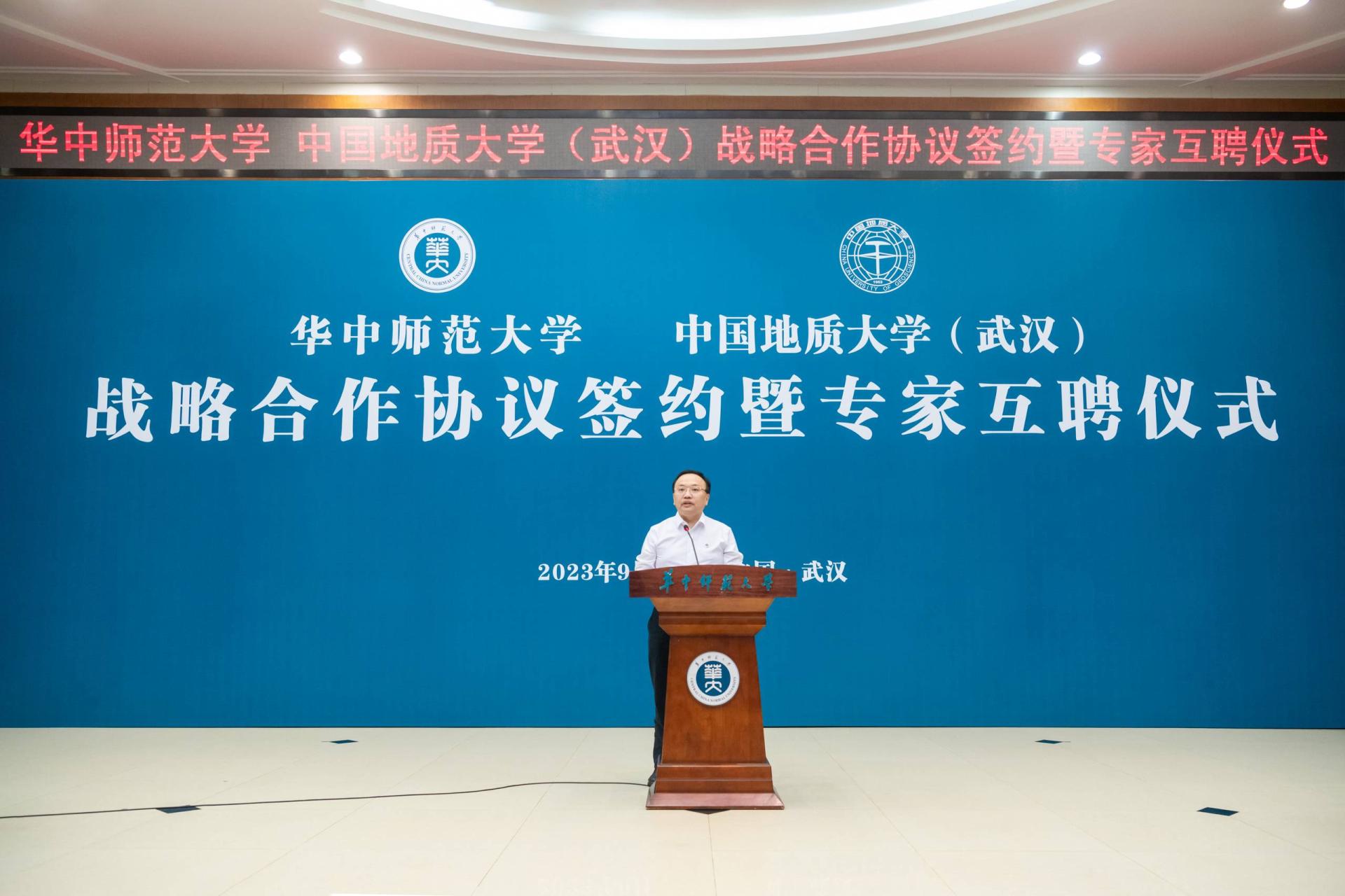 夏立新在讲话中表示,两校签订战略合作协议,充分发挥各自学科特色优势,在新工科、新文科建设上相互支持、携手共进,既是学校办学史上的一件大事,也是湖北高等教育事业高质量发展的一个重要里程碑。桂子山与南望山比肩而立,两校渊源深厚、历久弥新。“艰苦朴素、求真务实”是地质大学校训,“朴实”二字也刻入华师精神,写进华师血脉。严谨求实的科学精神,广博高雅的人文精神,自强不息的奋斗精神,立德树人的育才精神,构成了地大和华师共同的文化基因。精神气质相近、学科特色互补为两校携手发展奠定了良好基础。希望两校在今后的合作中扎根中国大地,携手服务党和国家重大战略需求,聚焦重点领域,强化优势互补,优化合作机制,拓展合作范围,实现双向赋能,为世界一流大学建设闯新路、创示范,为构建高质量高等教育体系、推动实现中国式现代化作出更大贡献。