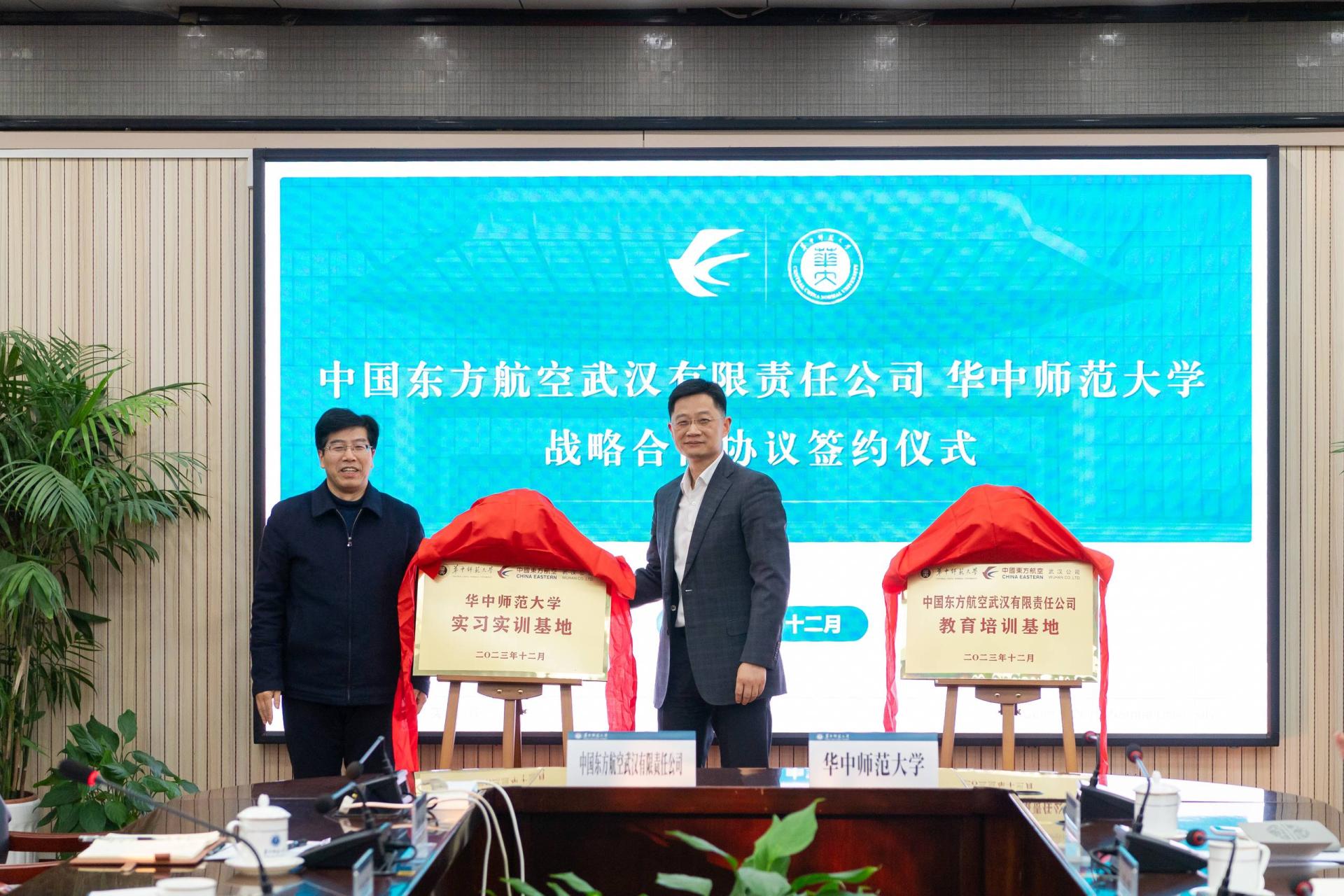 李良斌与彭双阶代表双方单位为中国东方航空武汉有限责任公司教育培训基地、凯发k8官网,凯发k8网址实习实训基地揭牌。
