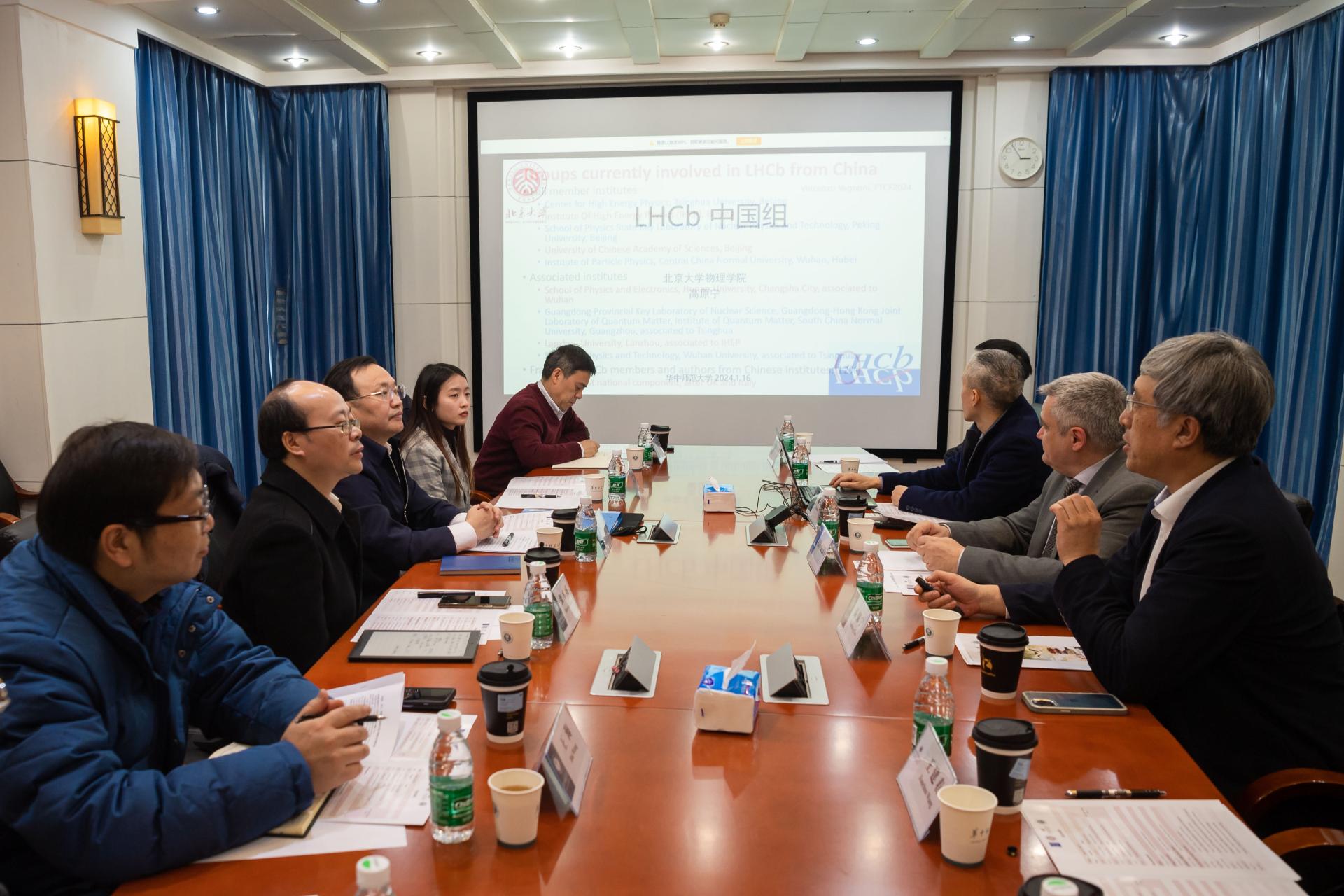 华大在线讯(通讯员 尹航)1月16日,欧洲核子研究中心—北京大学—中国科学院高能物理研究所—凯发k8官网,凯发k8网址粒子物理合作会谈在校举行。欧洲核子研究中心(CERN)LHCb国际实验组发言人文森佐.瓦尼奥尼博士、北京大学物理学院院长高原宁院士、校党委书记夏立新、中国科学院高能物理研究所实验中心副主任王建春研究员出席。科技处、国际合作与交流处、物理科学与技术学院负责人和粒子物理研究所相关人员参加会谈。