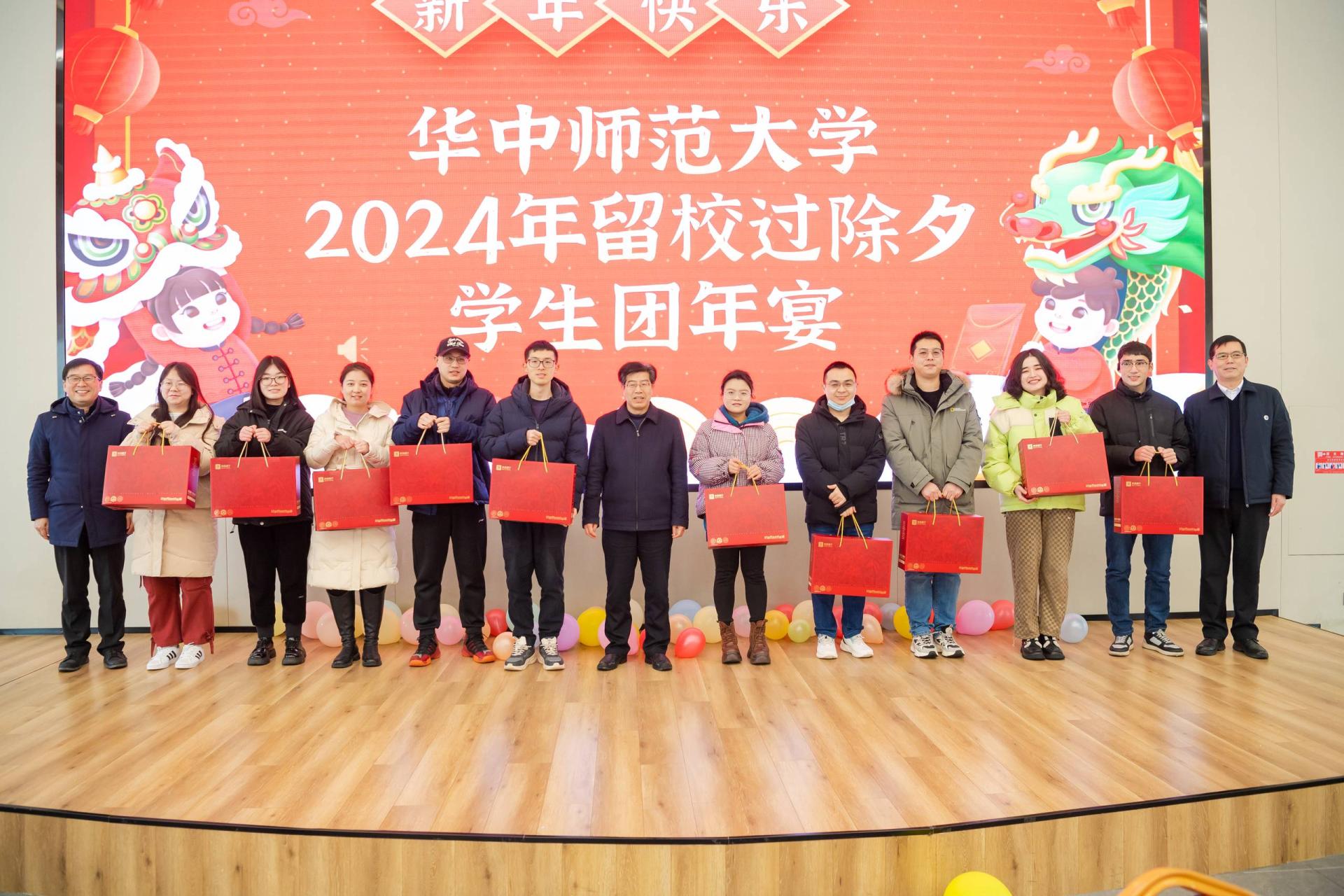 华大在线讯(记者 郝日虹)玉兔欢呈现旧岁,金龙献瑞迎新春。2月7日,2024年留校过春节学生团年宴在桂苑宾馆一楼中餐厅举行。校长彭双阶、副校长任友洲、校党委副书记陈迪明、各培养单位学生工作负责人及辅导员与120余名留校学生欢聚一堂,共迎新春佳节。