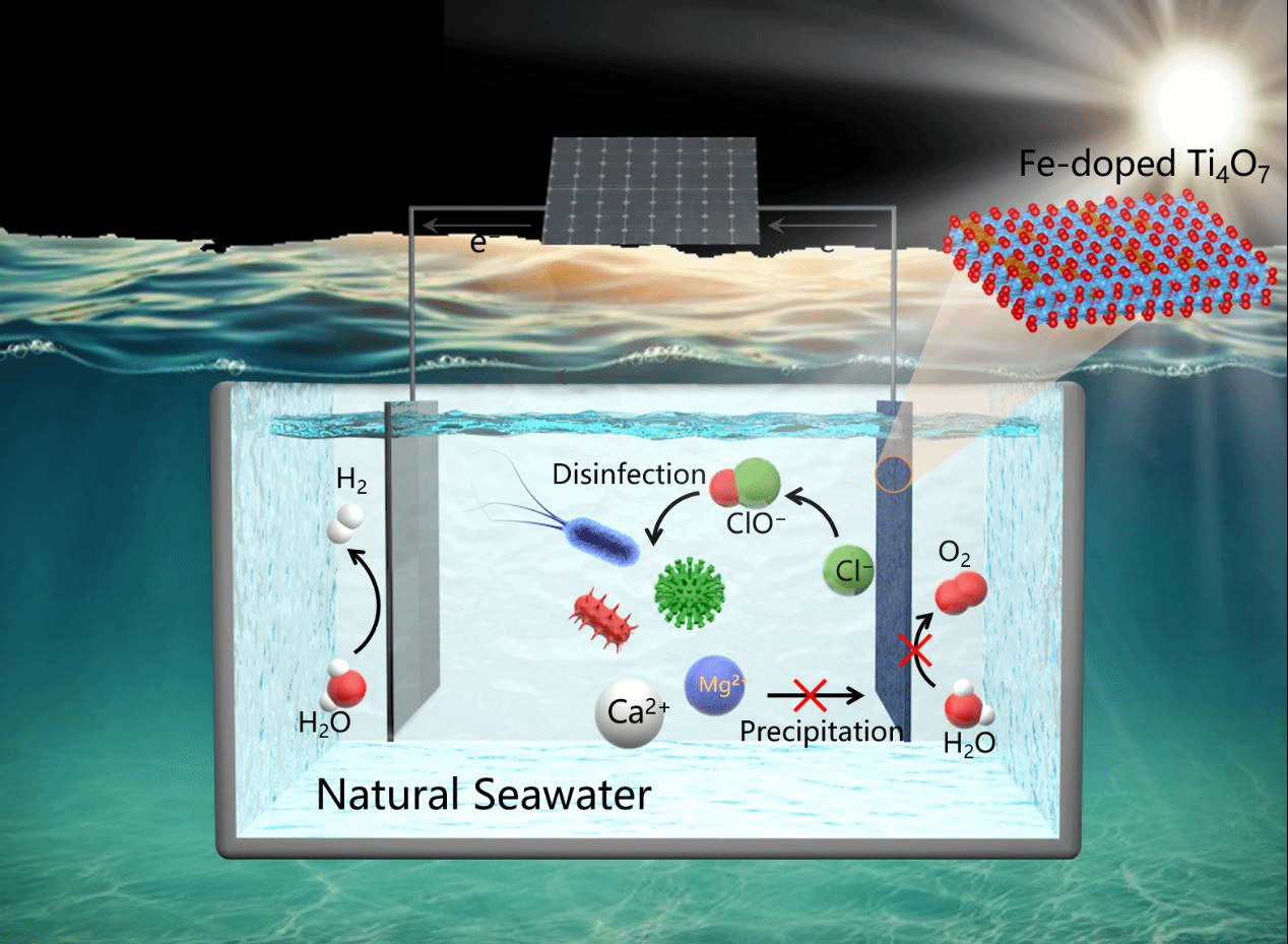针对这一挑战,该团队采用机械化学法制备了Fe掺杂Ti4O7电极(Fe-Ti4O7)。Fe掺杂增强了Ti4O7表面晶格氧活性位点的亲电性,显著提高了其在天然海水中活化低浓度氯离子的选择性,并有效抑制了碱土金属离子在电极表面的沉积。Fe-Ti4O7电解天然海水合成活性氯的选择性达到75%,显著优于传统商业DSA电极(45%),其固有周转频率和质量活性均比DSA高两个数量级,且在实验室条件下稳定运行10天无明显衰减,展现出了卓越的稳定性。该海水电解系统可采用商业硅光伏电池驱动,活性氯合成速率高达3.15 mg min?1,能够在五分钟内完全灭活远洋轮船压载水中常见的细菌,展示了良好的应用前景。该研究为活性氯合成提供了一种绿色、低碳、可持续的创新解决方案。该团队目前正在积极推进相关电极材料的产业化制备和应用技术开发。