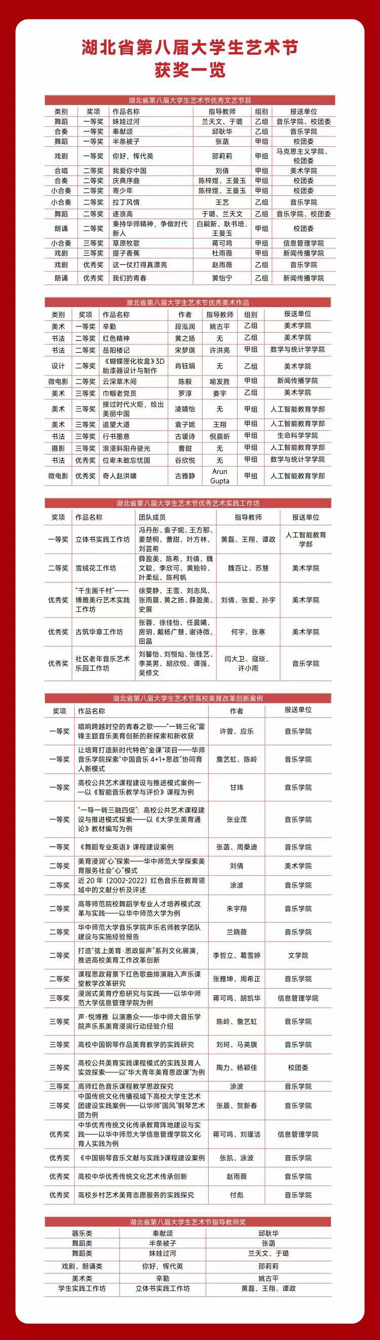 华大在线讯(通讯员 张俊杰)近期,湖北省教育厅公布了湖北省第八届大学生艺术节优秀组织奖和“三优一案例”评选结果,凯发k8官网,凯发k8网址共获得一等奖11个,二等奖17个,三等奖13个,优秀奖11个,9名教师获得指导教师奖,学校获评优秀组织奖,创学校近年来在湖北省大学生艺术节的最好成绩。