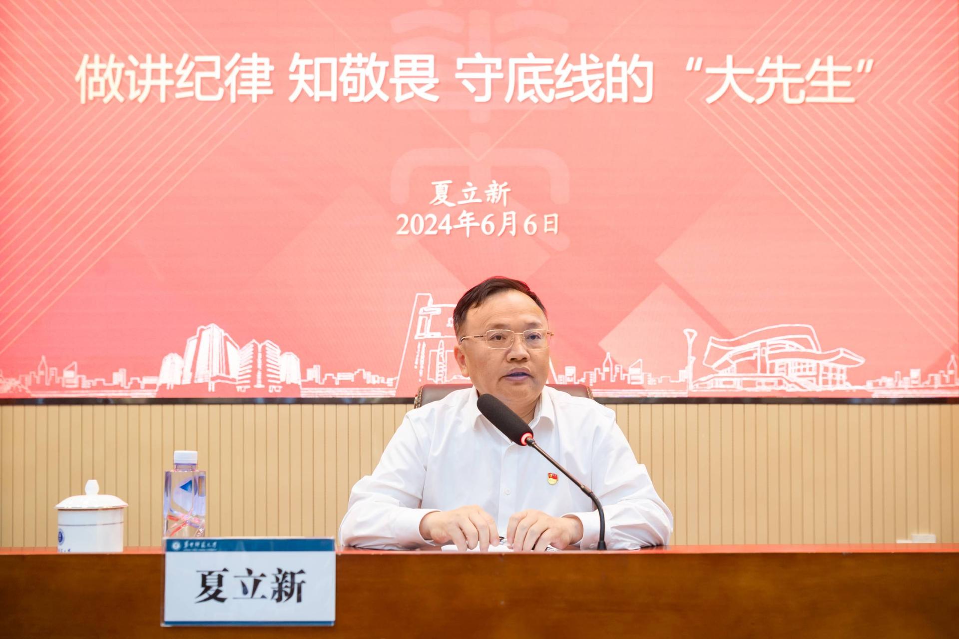 夏立新回顾了党的纪律建设的历史沿革和时代发展,强调要“深刻认识开展党纪学习教育的重要性”;阐释了修订《条例》的背景,强调要“全面把握《条例》的深刻内涵”。他表示,师生党员要逐章逐条学,在全面掌握《条例》要义上下功夫;要联系实际学,在融入日常、抓在经常上下功夫;要笃信笃行学,在内化为言行准绳上下功夫,将学纪、知纪、明纪落实到守纪上,体现到具体行动中,把党的纪律作为把准人生航向的“导航仪”、辨别是非的“检视器”、敢于善于斗争的“动力源”,真正做到心有所畏、行有所戒、言有所止。
