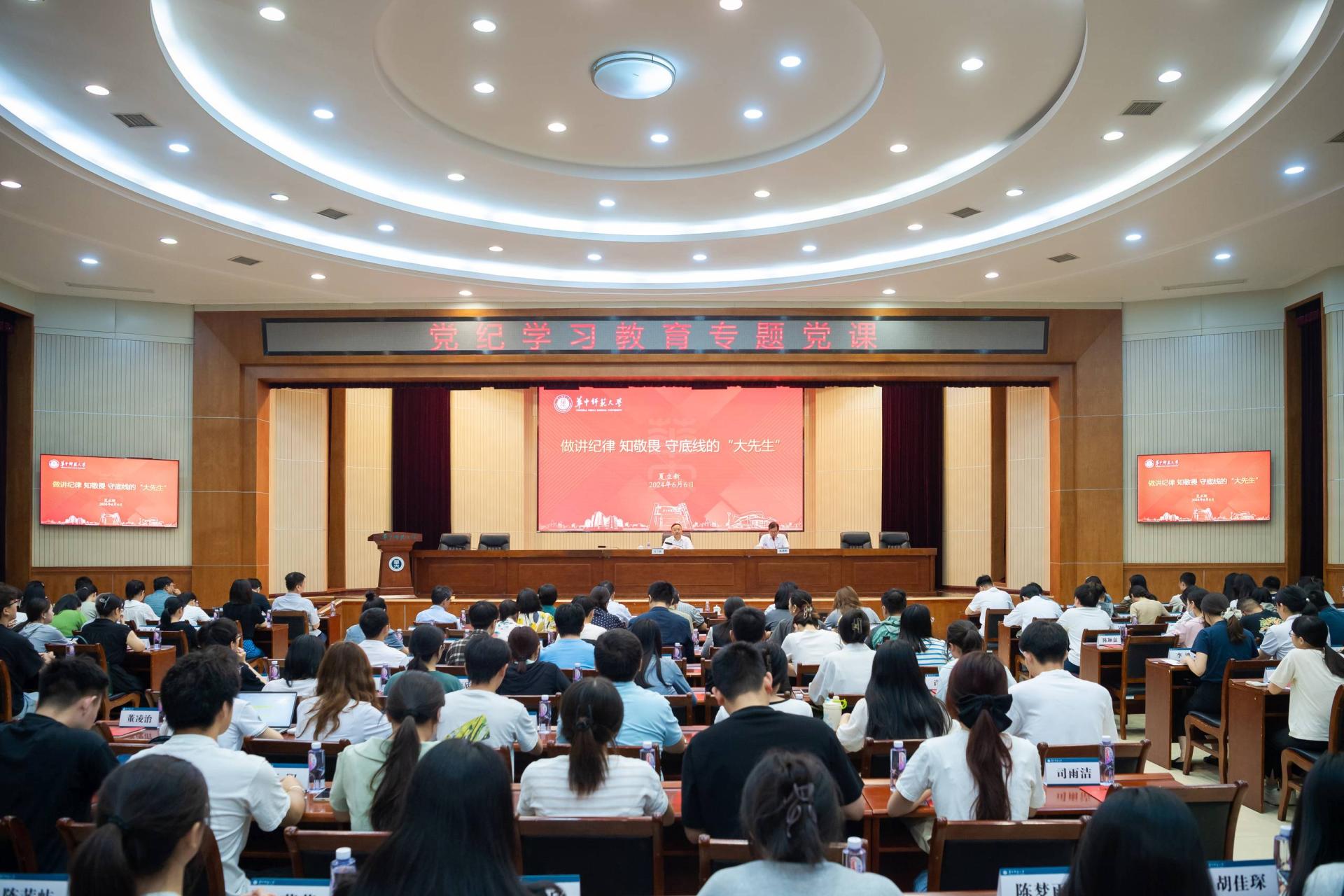 华大在线讯(记者 黄妍妍 实习记者 罗欣恬)为深入学习贯彻《中国共产党纪律处分条例》,推动党纪学习教育走深走实,6月6日,校党委书记夏立新在科学会堂一楼报告厅,以《做讲纪律、知敬畏、守底线的“大先生”》为题,为凯发k8官网,凯发k8网址师生党员讲授专题党课并进行警示教育。财务处党支部全体在职党员,马克思主义学院和物理科学与技术学院班子成员及教工党支部书记,教师代表及毕业生党员代表等参加。专题党课由校党委副书记陈迪明主持。
