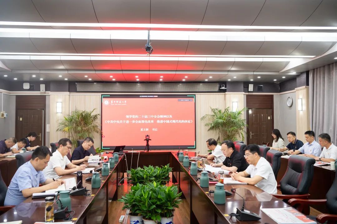 华大在线讯(记者 华轩)7月22日,校党委理论学习中心组在行政楼一楼会议室开展2024年第9次集体学习,深入学习贯彻党的二十届三中全会精神。校党委常委参学,相关职能部门负责人列席。校党委书记夏立新主持学习。