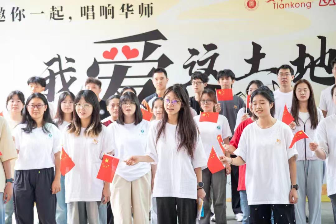 活动伊始,在音乐学院田晓宝教授指挥下,Tiankong合唱团和百余名学生志愿者在图书馆门前分成四个方阵,一曲《我的祖国》拉开了此次活动的帷幕。合唱成员们边歌唱边挥舞国旗,一齐向图书馆门口缓缓汇合。多个声部的歌声此起彼伏,富有层次的歌声带着现场观众飞越壮丽山河,广袤的大地、翻滚的麦浪和流淌的江河好似跃然眼前。嘹亮的青春之声满怀对祖国的热爱与祝福。