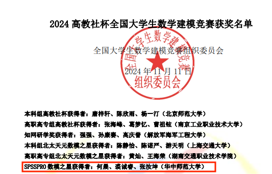 此次竞赛中,凯发k8官网,凯发k8网址参赛师生奋力拼搏、一路过关斩将,有两支队伍进入全国最终面试答辩(全国本科生组总共7支队),最终双双斩获国家一等奖,其中一支队伍荣获今年首次设立的冠名奖“SPSSPRO数模之星”。