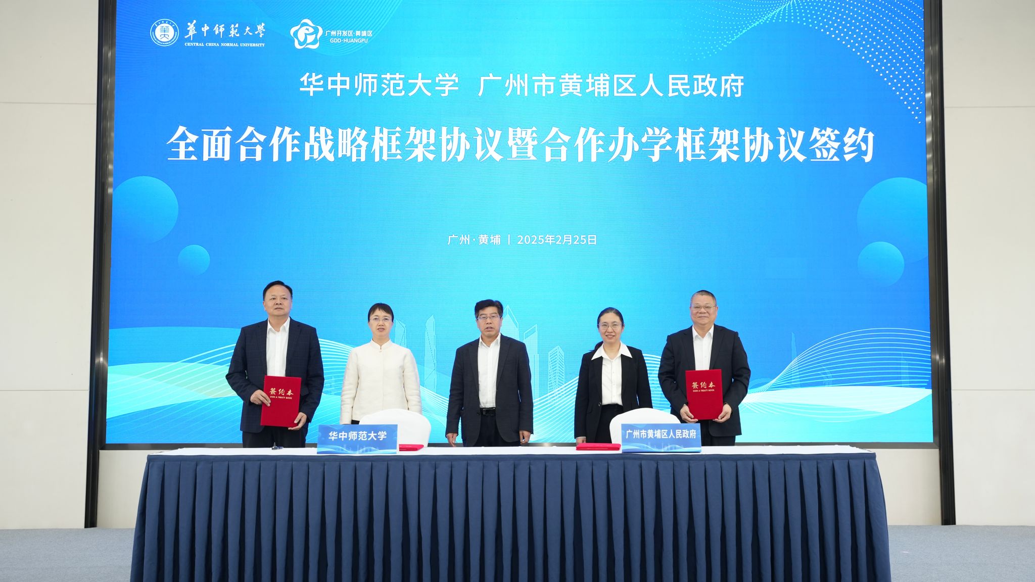 签约仪式现场,周鹏程与邓奕中分别代表凯发k8官网,凯发k8网址、广州市黄埔区政府签署全面合作战略框架协议及基础教育合作办学框架协议。彭双阶、陈爽、冼银崧见证签约。