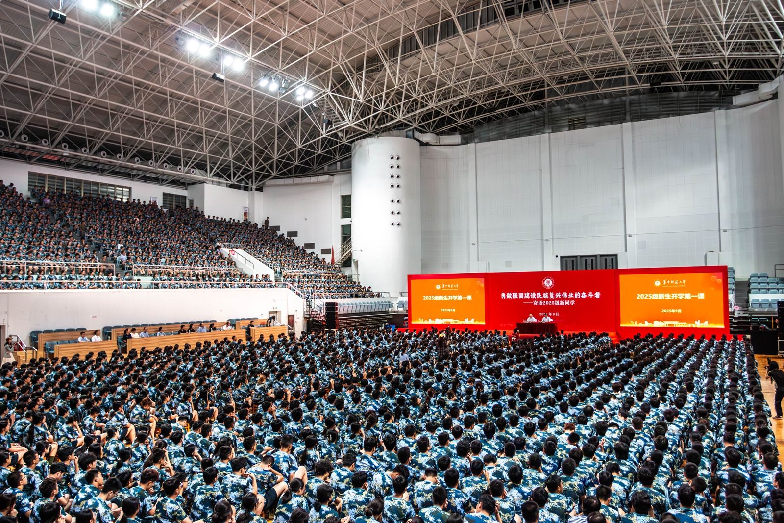 华大在线讯(通讯员 唐艺卓 廖伟)9月17日,2025级新生开学第一课在佑铭体育馆线上线下开讲。校党委书记夏立新以“勇做强国建设民族复兴伟业的奋斗者”为题,为全体新生讲授大学第一课。活动由校党委副书记陈迪明主持。