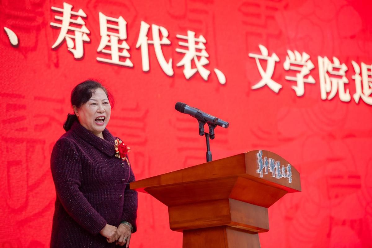 寿星代表、文学院退休教授吴满珍感谢学校各级领导对老同志的暖心关爱。成为“桂岳计划”主讲教授,继续站在三尺讲台践行“学知识首先学做人”的教育理念;作为银龄教师,两次赴新疆喀什大学和中国石油大学(北京)克拉玛依校区支教;参与学校“口述史”视频录制活动……吴满珍回顾了自己退休十年“追求老有所乐,实践老有所为”的生活,并表示,愿在今后的日子里,为老同志们服好务,为薪火相传而努力。