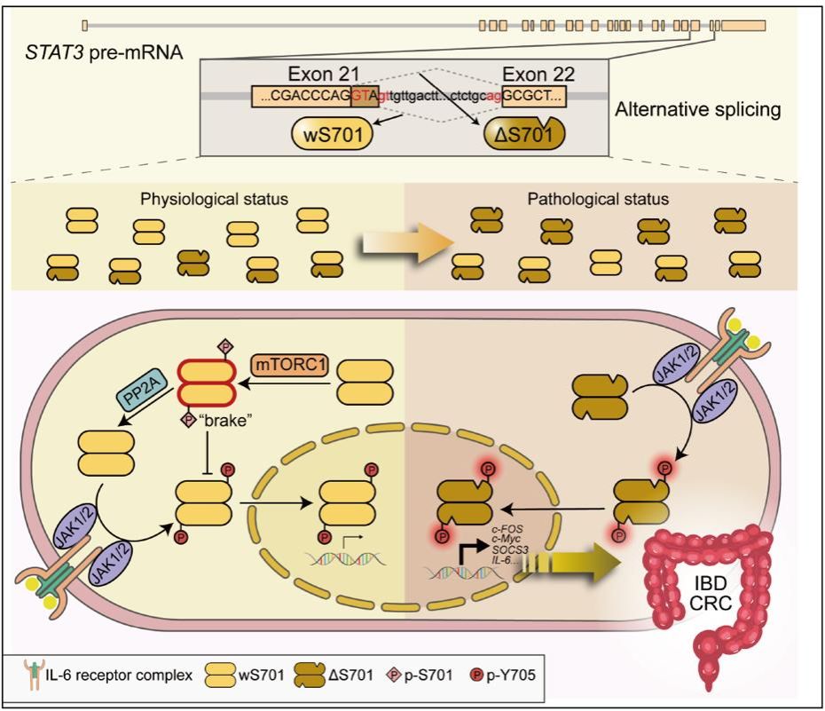 研究团队发现,STAT3的21号外显子存在一个隐含剪接位点,会选择性产生两种仅相差一个氨基酸(第701位丝氨酸,S701)的蛋白亚型——含S701的STAT3_wS701亚型与缺失S701的STAT3_ΔS701亚型。正是这一个氨基酸的“有无”,让STAT3的功能天壤之别:前者自带“分子刹车(S701)”,能避免炎症失控;后者则因缺失“刹车”,成为驱动结肠炎症-肿瘤转化的“超活跃加速器”。更为关键的是,目前临床与科研中广泛使用的“STAT3活化检测抗体”(针对Y705磷酸化),无法识别STAT3_ΔS701的活化状态。这意味着,过去许多患者体内STAT3的真实激活水平被严重低估,而这部分被忽视的“超活化”STAT3_ΔS701亚型,极有可能才是真正驱动疾病进展的“暗流”。