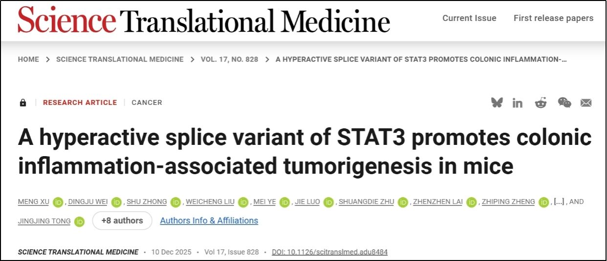 这项研究首次揭示了“由可变剪接导致的单个氨基酸差异”对STAT3功能的决定性影响——通过一个精巧的“前馈刹车”机制,深刻改写了对结肠炎症-肿瘤转化的认知。未来,针对STAT3不同亚型的特异性诊断工具与靶向药物开发,有望为IBD与CRC患者带来新的治疗希望。