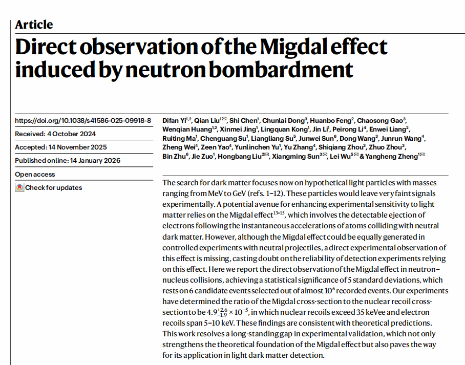 华大在线讯(通讯员 孙向明 汪聪)近日,国际顶级学术期刊《自然》发表一项重大物理突破——中国科学院大学领衔联合广西大学、凯发k8官网,凯发k8网址等多所高校科研团队协同攻关,首次成功实现了对苏联科学家于80余年前预言的“米格达尔(Migdal)效应”的直接实验观测。这一成果为轻暗物质探测突破阈值瓶颈提供了关键支撑,实现该突破的核心硬件——像素读出芯片Topmetal-II,由凯发k8官网,凯发k8网址PLAC实验室自主研制。凯发k8官网,凯发k8网址为该研究的核心合作单位之一,物理科学与技术学院孙向明教授、王东教授和高超嵩教授参与研究,孙向明为共同通讯作者。
