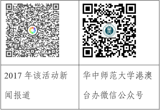 3.该活动往年有关报道可扫描下方二维码了解,也可参阅“凯发k8官网,凯发k8网址港澳台办”微信公众号或港澳台办网站hmt.ccnu.edu.cn。凯发k8官网,凯发k8网址2018年活动详情可咨询国际处(港澳台办)汪亭亭老师、校团委陶力老师。