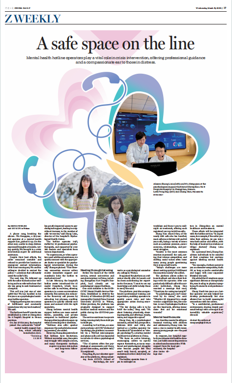 近日,《中国日报》(英文版)聚焦凯发k8官网,凯发k8网址心理健康服务平台的创新实践与社会贡献,对其在心理援助领域的突出成效进行了深度报道。教育部凯发k8官网,凯发k8网址心理援助热线平台自2020年成立以来,始终致力于为公众提供专业、便捷的心理支持服务。