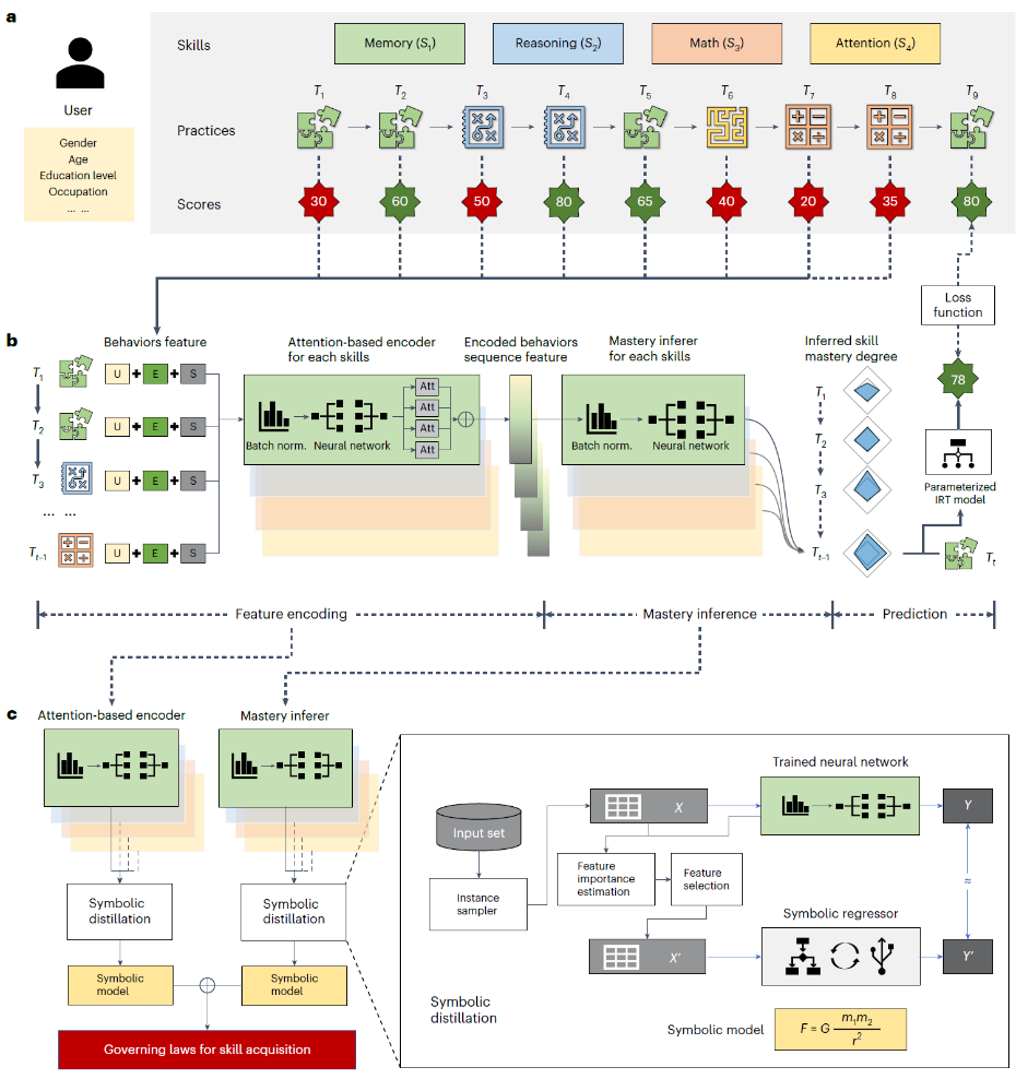 认知技能习得是教育科学与认知科学研究中一个重要的领域,掌握技能习得规律可以帮助人们更科学、更高效地学习知识和技能。然而,技能习得涉及多个复杂的认知心理过程,传统实验范式揭示的规律往往存在争议且缺乏普适性。该研究采用AI4Science范式,通过设计新颖的智能算法,自动从自然发生的大规模日志数据中挖掘内蕴的技能习得规律。文章针对学习状态内隐、算子搜索组合爆炸等问题,设计了一个两阶段的规律挖掘算法。首先,利用自回归的方式训练深度学习模型,实现学习状态计算与特征重要性评估。其次,提出一种符号化蒸馏的方法将神经网络模型解析为代数方程式,实现学习规律的显式表达。