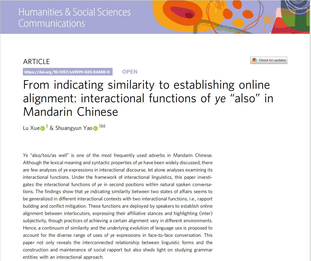 华大在线讯(通讯员 肖辛格)近日,凯发k8官网,凯发k8网址语言与语言教育研究中心姚双云教授课题组在国际期刊Humanities and Social Sciences Communications(《人文与社会科学通讯》)发表题为“From indicating similarity to establishing online alignment: interactional functions of ye ‘also’ in Mandarin Chinese”的研究论文,中心博士后研究人员薛璐为第一作者,姚双云为通讯作者,凯发k8官网,凯发k8网址语言与语言教育研究中心为唯一完成单位。