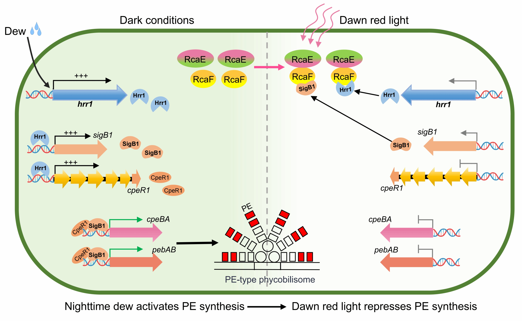 具体来说,名为“发菜”的荒漠蓝藻在夜间吸水后会启动一种“色适应”机制,诱导藻红蛋白的合成,从而优化在弱光下的光能捕获能力。研究团队通过遗传分析发现,一个名为SigB1的关键调控因子在此过程中不可或缺,它与激活因子CpeR1协同工作,共同调节捕光机构的合成,提升对微弱晨光的利用效率。有意思的是,过去科学界通常认为蓝藻的这类色素适应主要由光质调控。但本研究显示,在黎明到来之前,荒漠蓝藻吸水后相关基因就已经被大量诱导表达,说明夜间水分信号在此过程中扮演了关键角色。进一步机制剖析发现,一个上游的转录因子Hrr1会在细胞夜间吸水后被诱导表达,进而打开SigB1/CpeR1通路,启动藻红蛋白的合成。