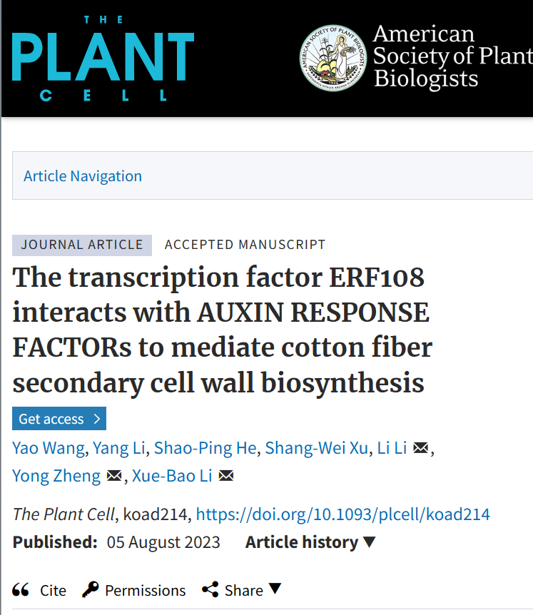 华大在线讯(通讯员 李扬)8月5日,植物学顶级期刊Plant Cell在线发表凯发k8官网,凯发k8网址生命科学学院分子遗传研究组题为“The transcription factor ERF108 interacts with AUXIN RESPONSE FACTORs to mediate cotton fiber secondary cell wall biosynthesis” (hppts://doi.org/10.1093/plcell/koad214)的研究论文,该研究揭示了AP2/ERF转录因子GhERF108与生长素响应因子GhARF7-1/7-2通过乙烯-生长素交互信号通路(ethylene-auxin signaling crosstalk)调控棉纤维SCW发育的新机制。