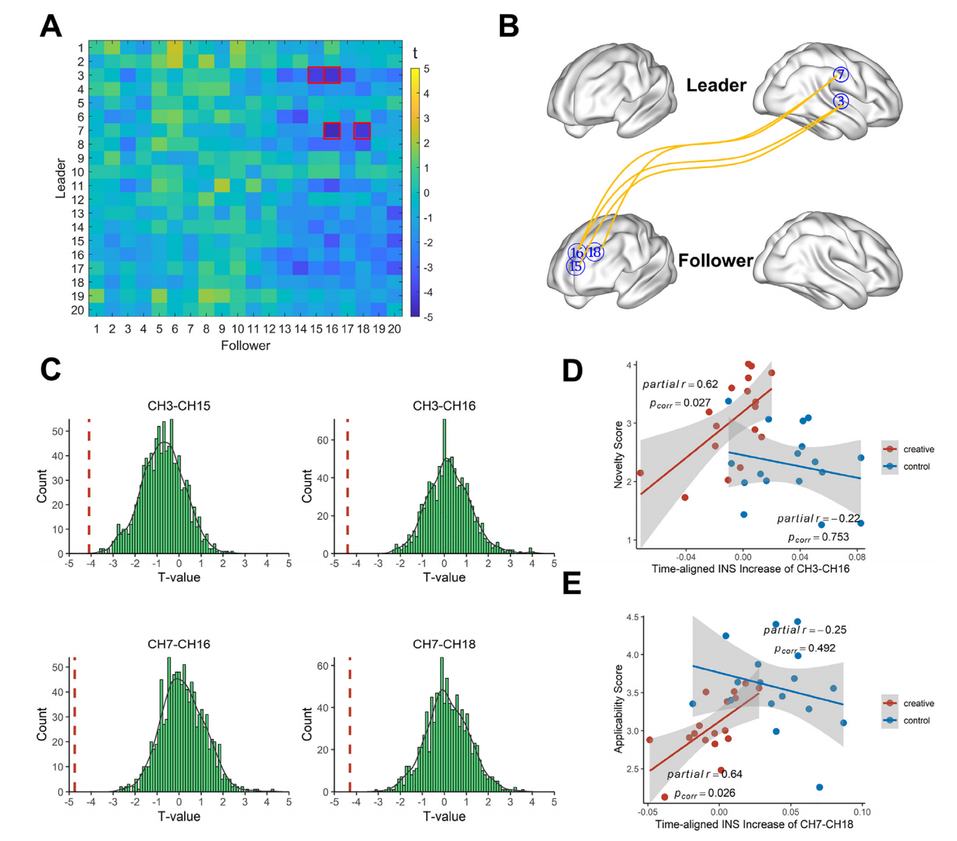 图2:团体创造中思路引领者和追随者的大脑间神经同步及其与观点创造性的关系